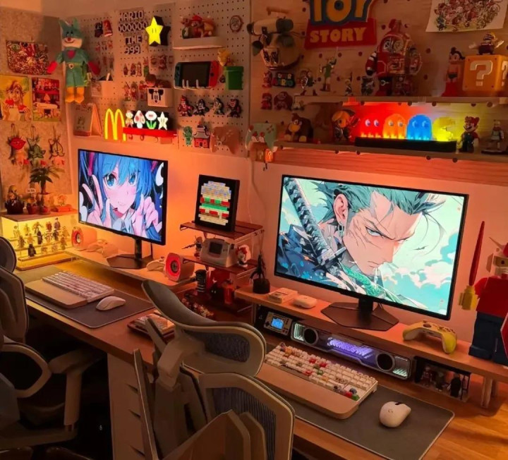我家次卧做了L形状的电竞区,在靠墙的位置打上了一整扇的手办墙,还有猫猫的陪伴,简直太舒服了。